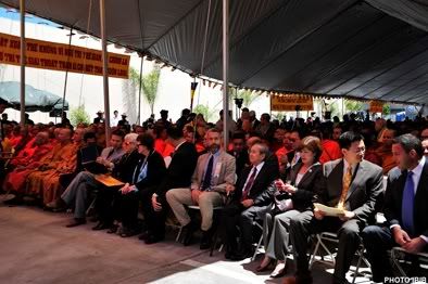Các quan khách Hoa kỳ và Quốc Tế đến tham dự, Bà Thị Trưởng Rice-Tóc bạc ngồi bên tráiHai người khách quốc tế là Thượng Nghị sĩ Quốc hội Ý Đại Lợi, ông Marco Perduca, và ông Scott Flipse đều nói lên sự gắn bó với tự do tôn giáo, nhân quyền Việt Nam và đặc biệt là với cá nhân Đại lão Hòa thượng Thích Quảng Độ, vị lãnh đạo tối cao Giáo hội Phật giáo Việt Nam Thống nhất, Trong phần phát biểu Thượng Nghị sĩ Marco Perduca cho biết, theo lời dịch của Thượng tọa Thích Giác Đẳng :“Có nhiều lần Đảng của ông ở Âu châu đã cử người về Việt Nam để tiếp xúc với Đại lão Hòa thượng Thích Quảng Độ, Viện Hóa Đạo, Giáo hội Phật giáo Việt Nam Thống nhất. Và cũng có trường hợp của ông Marco Pannella, Dân biểu Quốc hội Châu Âu và bản thân ông đã tìm cách đi vào Saigon. Nhưng rốt cuộc bị chặn lại ở Campuchia, không thể vào Việt Nam. Ông biết không phải vấn đề visa, vấn đề an ninh, mà ông biết có lý do sâu xa. Đó là bởi vì chính quyền Hà Nội đã e dè với sự tiếp xúc của một con người sống ở trong sự quản thúc, sống ở trong sự thầm lặng. Nhưng tiếng nói có một ảnh hưởng lớn. Tiếng nói đó có một sức mạnh quan trọng liên quan đến tình trạng của đất nước Việt Nam, của Phật giáo Việt Nam, đó là Đại lão Hòa thượng Thích Quảng Độ”.Tiến sĩ Scott Flipse nhắc lại các lần gặp Đại lão Hòa thượng Thích Quảng Độ ở Saigon :