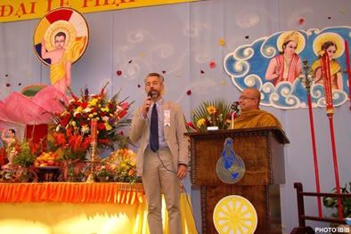 “Ông có cơ duyên đặc biệt đã gặp được tận mặt chính Hòa thượng Thích Quảng Độ ba lần. Đại lão Hòa thượng Viện trưởng nhìn ông nói rằng : Ông Scott, ông biết rất nhiều về Việt Nam, ông hoạt động rất nhiều về Việt Nam, có lẽ kiếp trước ông là người Việt Nam”. Ông đã trả lời rằng : “Kính bạch Hòa thượng con là một người theo Catholic, theo Thiên chúa giáo La Mã, và con không học về tín lý của sự tái sinh. Nhưng con sẽ làm việc rất nhiều, sẽ tìm hiểu rất nhiều để trong đời kết tiếp sau con sẽ làm người Việt Nam”.Được mời phát biểu về nhân quyền và tôn giáo, ông Võ Văn Ái, Phát ngôn nhân Viện Hóa Đạo trong nước và Tổng vụ trưởng Ngoại vụ của Giáo hội ở hải ngoại cho biết tình trạng chùa Giác Minh ở Đà Nẵng bị đàn áp nhân lễ Phật Đản :“Hôm qua chúng tôi nhận được một tin từ Hòa thượng Thích Thanh Quang ở Đà Nẵng tại chùa Giác Minh. Bức thư Hòa thượng gửi là Thông báo của ông Phó chủ tịch Ủy Ban Nhân dân gửi cho Hòa thượng Thích Thanh Quang. Trong Thông báo có 2 điều quan trọng. Chúng tôi xin phép đọc quý vị nghe :“1. Tổ chức lễ Phật Đản – Phật lịch 2555 tại cơ sở Thờ tự Giác Minh đảm bảo đúng tinh thần thuần túy tôn giáo, tuân thủ các quy định của pháp luật. Đảm bảo tình hình an ninh chính trị – trật tự an toàn xã hội.“2. Không được treo băng rôn, biểu tượng có nội dung Giáo hội Phật giáo Việt Nam Thống nhất. Không được đọc Thông bạch, thông điệp của Thích Quảng Độ và các tài liệu khác trái với pháp luật Việt Nam.“Chúng ta biết rằng trong hai ngày nữa chùa Giác Minh sẽ bị đàn áp. Đặc biệt như ta thấy là không cho phép đọc Thông bạch, Thông điệp của Đại lão Hòa thượng Thích Quảng Độ. Làm sao một tổ chức tôn giáo ngày Đản sinh của Đức Phật mà không được đọc Thông điệp của vị Giáo chủ tôn giáo này ? Đây là chứng cớ rõ ràng Nhà cầm quyền Cộng sản đang đàn áp không riêng tại chùa Giác Minh mà tất cả 20 ngôi chùa tại Miền Trung và Miền Nam đại diện cho Giáo hội Phật giáo Việt Nam Thống nhất”.Trước khi bước sang phần Đại lễ Phật Đản theo hai truyền thống Bắc tông và Nam tông, kết thúc phần phát biểu, Đại lão Hòa thượng Thích Chánh Lạc, Phó Viện trưởng Viện Hóa Đạo kiêm Phó Chủ tịch Hội đồng Điều hành GHPGVNTN Hải ngoại tại Hoa Kỳ, và Pháp sư Niên trưởng Thích Giác Đức, Tổng ủy viên Kế hoạch Văn phòng II Viện Hóa Đạo kiêm Phó chủ tịch Đặc trách Kế hoạch Hội đồng Điều hành GHPGVNTN Hải ngoại tại Hoa Kỳ, cùng lên lễ đài nói về ý nghĩa của Ngày Phật Đản sinh.Sau nghi lễ chính đại diện chư Tăng các nước Tây Tạng, Nhật Bản, Trung hoa, Đại Hàn, Miến Điện, Tích Lan, Cam Bốt, Lào, v.v… tiến lên lễ đài tụng kinh Mừng Khánh Đản theo ngôn ngữ nước mình trong khi Ban tổ chức thực hiện Lễ Nhiên đăng, Lễ Mộc dục và Phóng sanh.Đại lễ kết thúc với việc phát phần thưởng cho những học sinh ưu tú có bài viết về Phật Đản được trúng giải.