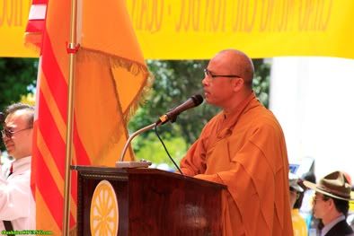 Thượng Tọa Thích Viên Lý phát biểu trong ngày lễ Phật Đản thứ 2555Trong bài Diễn văn Khai mạc đại lễ của Trưởng ban Tổ chức, Thượng tọa Thích Viên Lýnhắc tới mục tiêu của Giáo hội và hạnh nguyện của vị lãnh đạo tối cao Giáo hội Phật giáo Việt Nam Thống nhất :“Trong Hiến Chương của Giáo Hội Phật Giáo Việt Nam Thống Nhất, Giáo Hội kế thừa truyền thống lịch sử Phật Giáo lâu đời tại Việt Nam đã khẳng định : “Giáo Hội Phật Giáo Việt Nam Thống Nhất không đặt sự tồn tại của mình nơi nguyên vị cá biệt mà đặt sự tồn tại ấy trong sự tồn tại của nhân loại và dân tộc”. Trên căn bản của một tôn chỉ vị tha vô ngã như thế, hơn suốt ba thập niên qua, dù đã và đang bị tù đày, quản thúc, Đại lão Hòa thượng Thích Quảng Độ, Xử lý Thường vụ Viện Tăng Thống kiêm Viện trưởng Viện Hóa Đạo vẫn vô úy thể hiện Bồ Tát hạnh của mình một cách kiên định, uy dũng”.Sau khi nhắc tới những thiên tai xẩy ra khắp thế giới cho nhân loại, từ Nhật đến Trung Mỹ, mà người Phật tử phải chăm lo, Đức Phó Tăng thống Thích Hộ Giác, Chủ tịch Văn phòng II Viện Hóa Đạo nhắc nhở hoàn cảnh bị đàn áp của Giáo hội trong nước. Hòa thượng nói :“Giáo Hội tiếp tục tồn tại trong sự đàn áp của nhà cầm quyền. Những vận động phục hoạt pháp lý sinh hoạt cũng như cho nhân quyền, tự do, dân chủ đối diện với những chính sách triệt tiêu có hệ thống của chế độ cộng sản Việt Nam. Những gian khổ đó là hệ lụy tự nhiên. Nhưng không vì vậy mà chúng ta bỏ cuộc. Từ bao thập niên qua đã là vậy mà mai nầy cũng vậy. Cho tới khi chế độ cộng sản chấm dứt thì chúng ta mới thật sự có tự do”.Toàn thể Phật tử đã xúc động lắng nghe Đại lão Hòa thượng Thích Quảng Độ tuyên đọc Thông điệp Phật Đản thu âm từ Thanh Minh Thiền Viện ở Saigon. Hòa thượng kết thúc bằng lời kêu gọi (xem toàn văn Thông điệp trên Trang nhà Quê Mẹ www.queme.net) :“Ngôi nhà Việt Nam sau một trăm năm bị ngoại xâm chiếm đóng, sáu mươi lăm năm huynh đệ tương tàn rồi độc tài toàn trị. Đã đến lúc người Phật tử không thể khoanh tay đứng ngó hay than thân trách phận, chờ đợi kiếp sau, mà phải đứng lên noi gương Ngài A Dục từ bỏ con đường bạo lực, mở lượng từ bi, khai thông trí tuệ, nối tiếp Con Đường Phật 2555 năm trước.“Có như thế, chúng ta mới thành kính Nhớ Phật, trả ơn Phật trong ngày Phật đản năm nay”.Về phần quan khách Hoa Kỳ, Bà Margie Rice, Thị trưởng thành phố Westminster, mở đầu bằng tiếng Việt bốn chữ “Kính chào quý vị” rồi bà nói :“Nhân danh Hội đồng thành phố Westminster, tôi Thị trưởng, xin nói lên niềm vinh hạnh được đến đây tham dự Đại lễ Phật Đản. Chúng tôi hãnh diện trong cuộc tham gia này. Đạo Phật là đạo Từ Bi, và các bạn cũng cảm thấy niềm từ bi tràn ngập ở đây. Nên tôi muốn chào đón tất cả quý vị từ khắp nơi trong thế giới về dự lễ”.