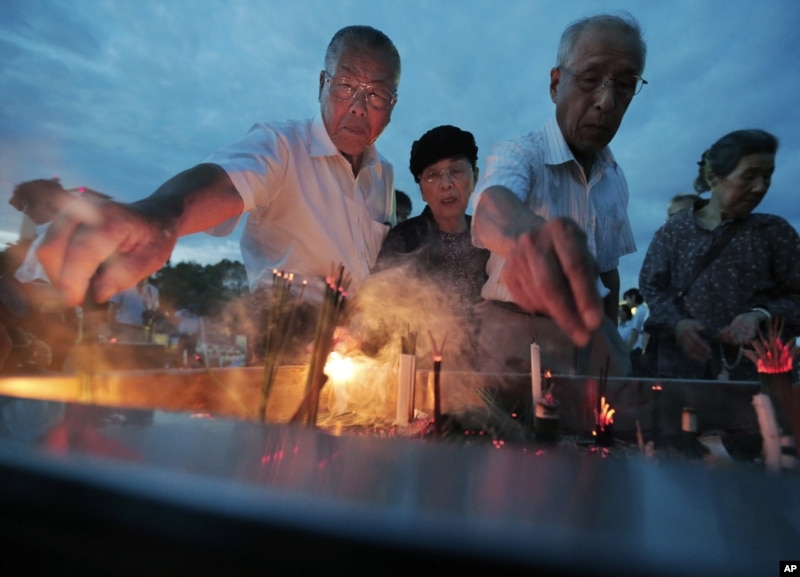 Dân Nhật đốt nhang cầu nguyện tại mộ bia của các nạn nhân của vụ ném bom nguyên tử tại Công viên Tưởng niệm Hòa bình Hiroshima, ngày 6/8/2012