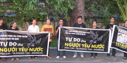 Xin nhắc lại, hôm qua trong một phiên xử diễn ra chỉ trong vài giờ, ba blogger Nguyễn Văn Hải tức Điếu Cày, Tạ Phong Tần, Phan Thanh Hải tức Anhbaisaigon, đã bị kết án lần lượt 12, 10 và 4 năm tù, kèm theo từ 3 đến 5 năm quản chế. Họ phải ra tòa vì tội danh “tuyên truyền chống Nhà nước” và“âm mưu lật đổ chế độ”, có khung hình phạt lên đến 20 năm tù, vì đã viết blog tố cáo tham nhũng, bất công và chính sách đối ngoại của Hà Nội.